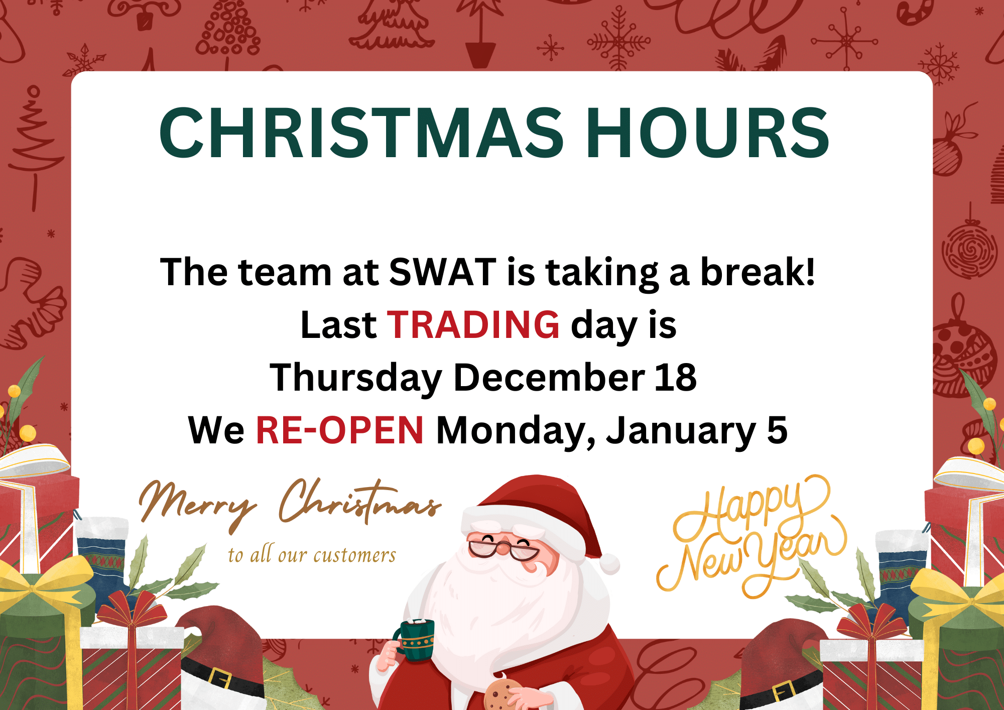 The team at SWAT will soon be taking a festive break! Last trading date will be THURSDAY, DECEMBER 18 and