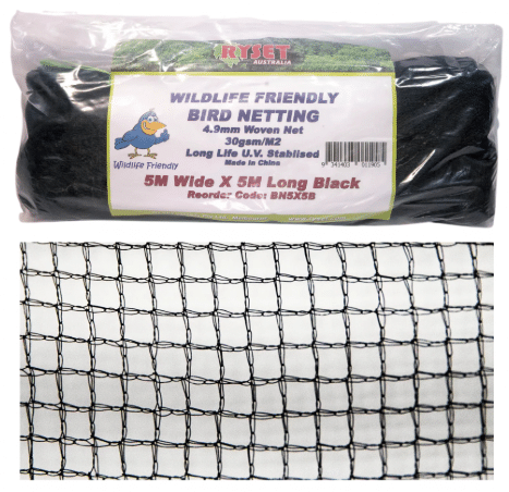 - SWAT stocks Ryset bird-netting – a lightweight design, easy to install, and strong enough to keep out pests and protect plants. Featuring a mesh density of less than 5mm, this bird netting is highly effective in keeping out birds, bats, possums, snakes, and other wildlife without causing harm.
